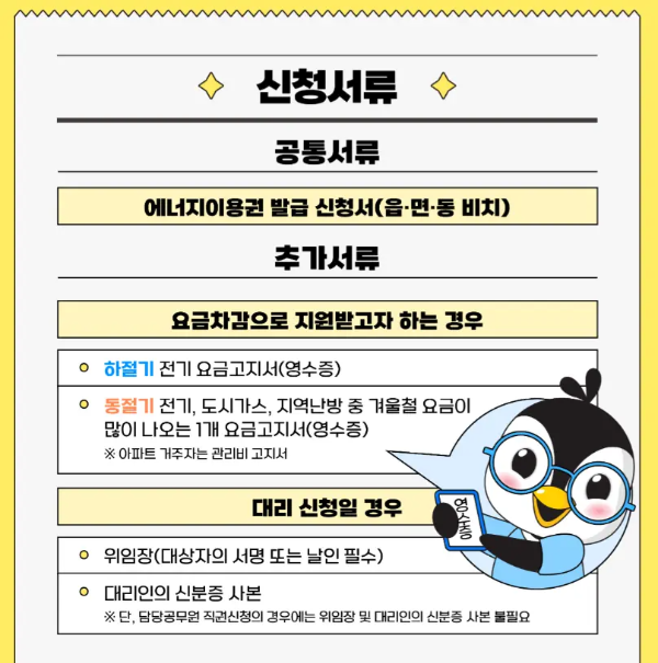 요금차감으로 지원받고자 하는 경우에는 하절기는 전기 요금고지서를, 동절기는 전기/도시가스/지역난방 중 요금이 많이 나오는 1개 요금고지서를 제출하시면 됩니다.